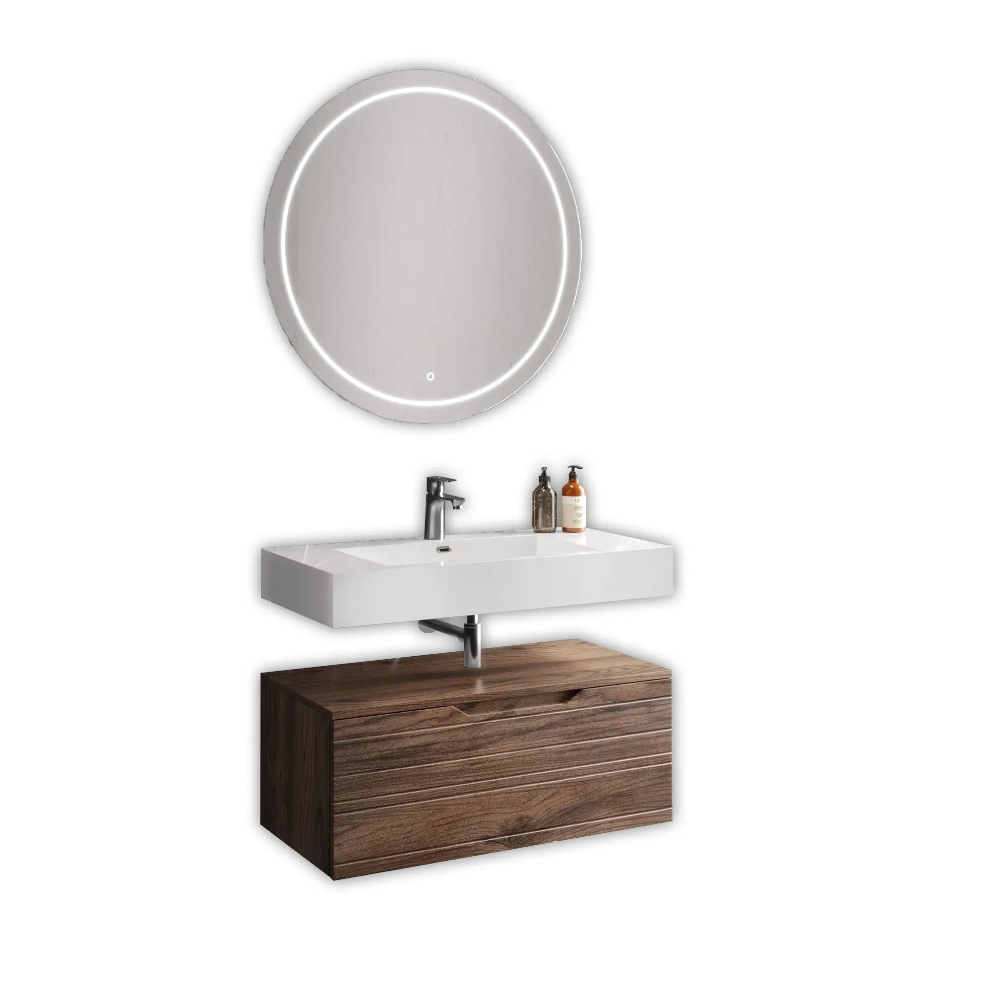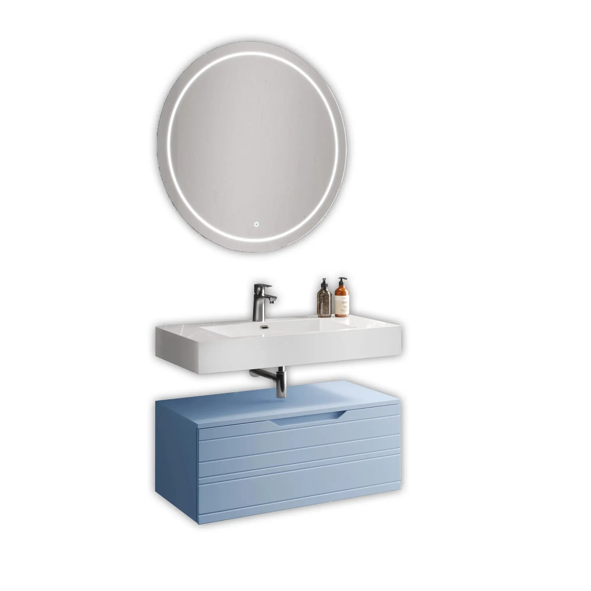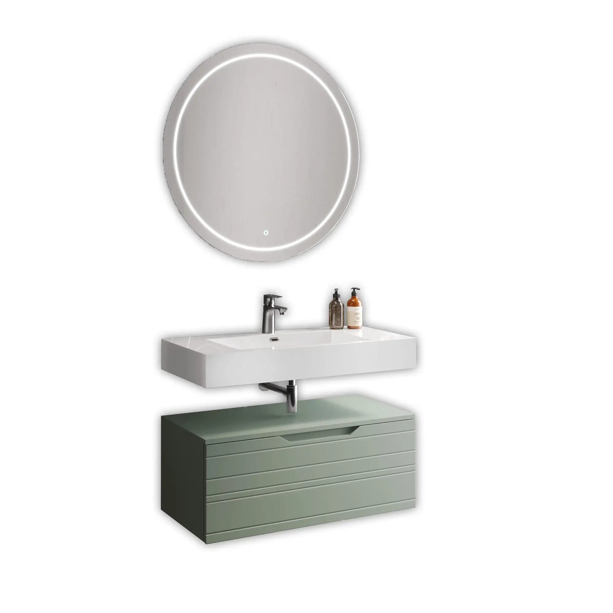 Mobile bagno 120cm con top lavabo scatolato in resina bianco lucido, ad installazione sospesa, disponibile in 9 finiture, dotato di un comodo cassettone a chiusura ammortizzata e con maniglia a gola e specchio rotondo a luce led perimetrale.