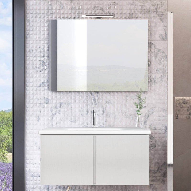 Composizione sospesa mobile bagno da 80cm con base a due ante sottolavello con chiusura ammortizzata. Il mobile è largo 80cm, profondo 45,5cm ed alto 46cm, ed è abbinato ad un lavabo ad incasso comodo e capiente realizzato in ceramica bianca lucida di prima scelta, con foro troppo pieno.