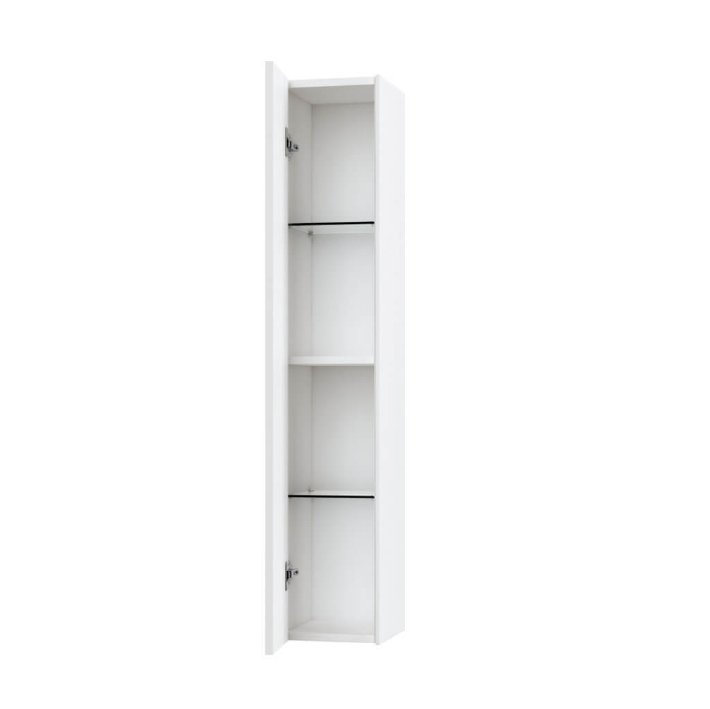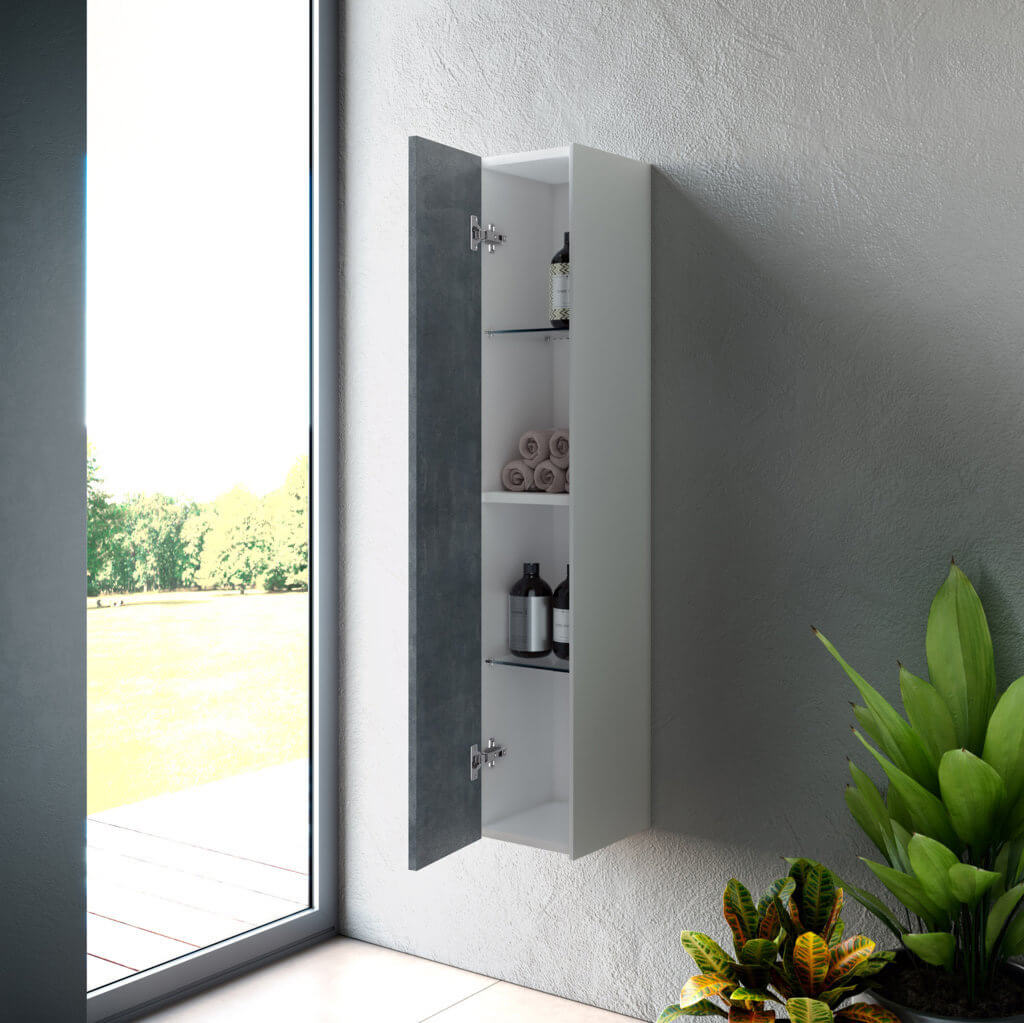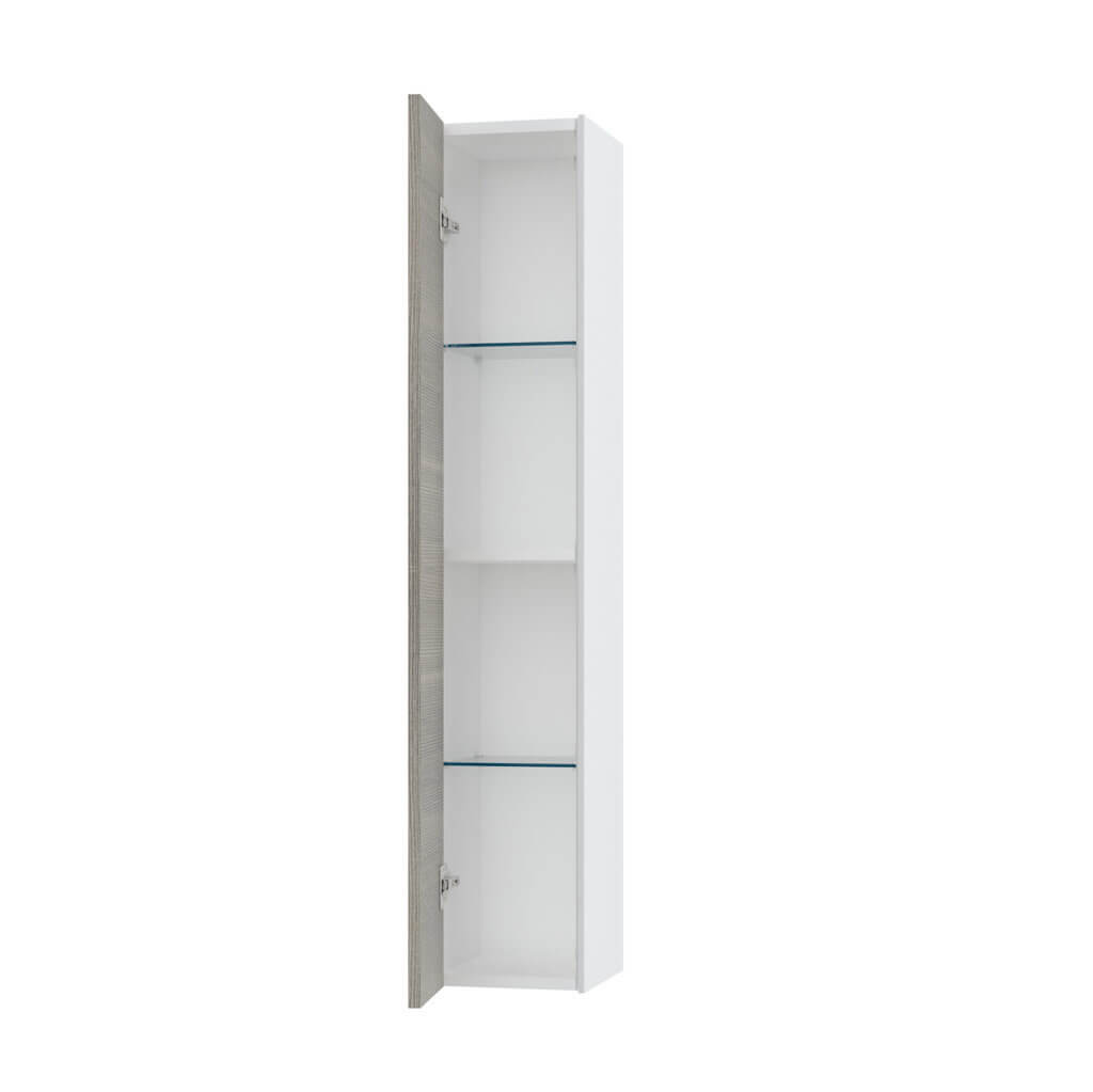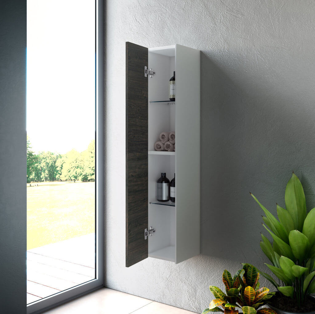 Elegante pensile colonna per bagno Made in Italy con installazione sospesa, pratico, reversibile ed elegante, disponibile in 12 finiture, realizzato in melaminico antigraffio con fianchi laterali laccati ed apertura push. Internamente la colonna dispone di due pratiche mensole realizzate in elegante vetro temperato + un ripiano realizzato in melaminico antigraffio. Pannelli certificati FSC. Made in Italy.