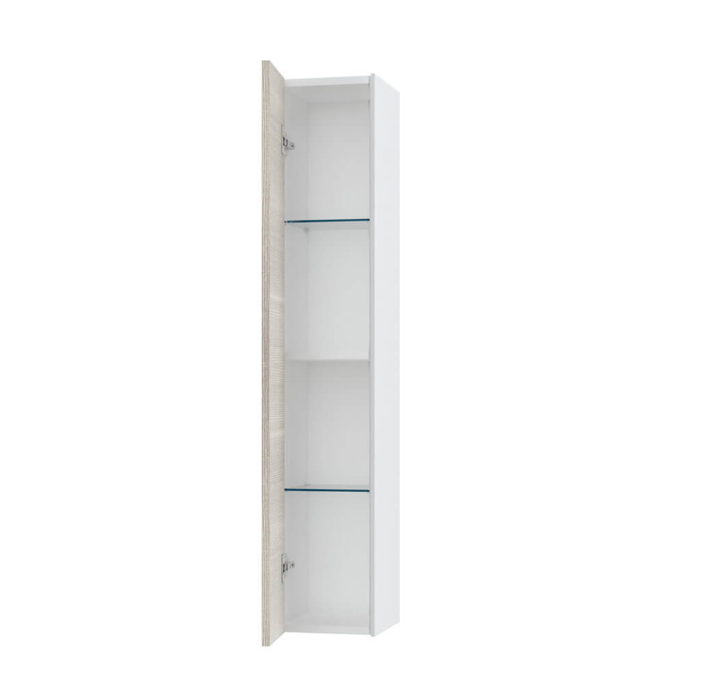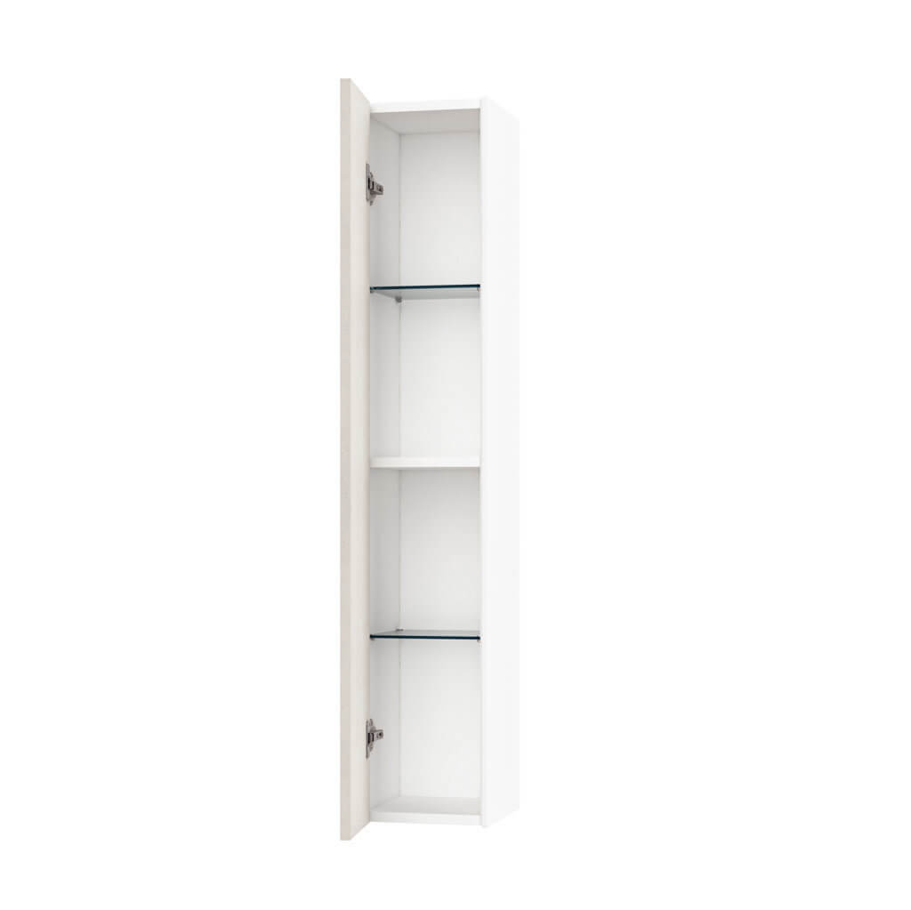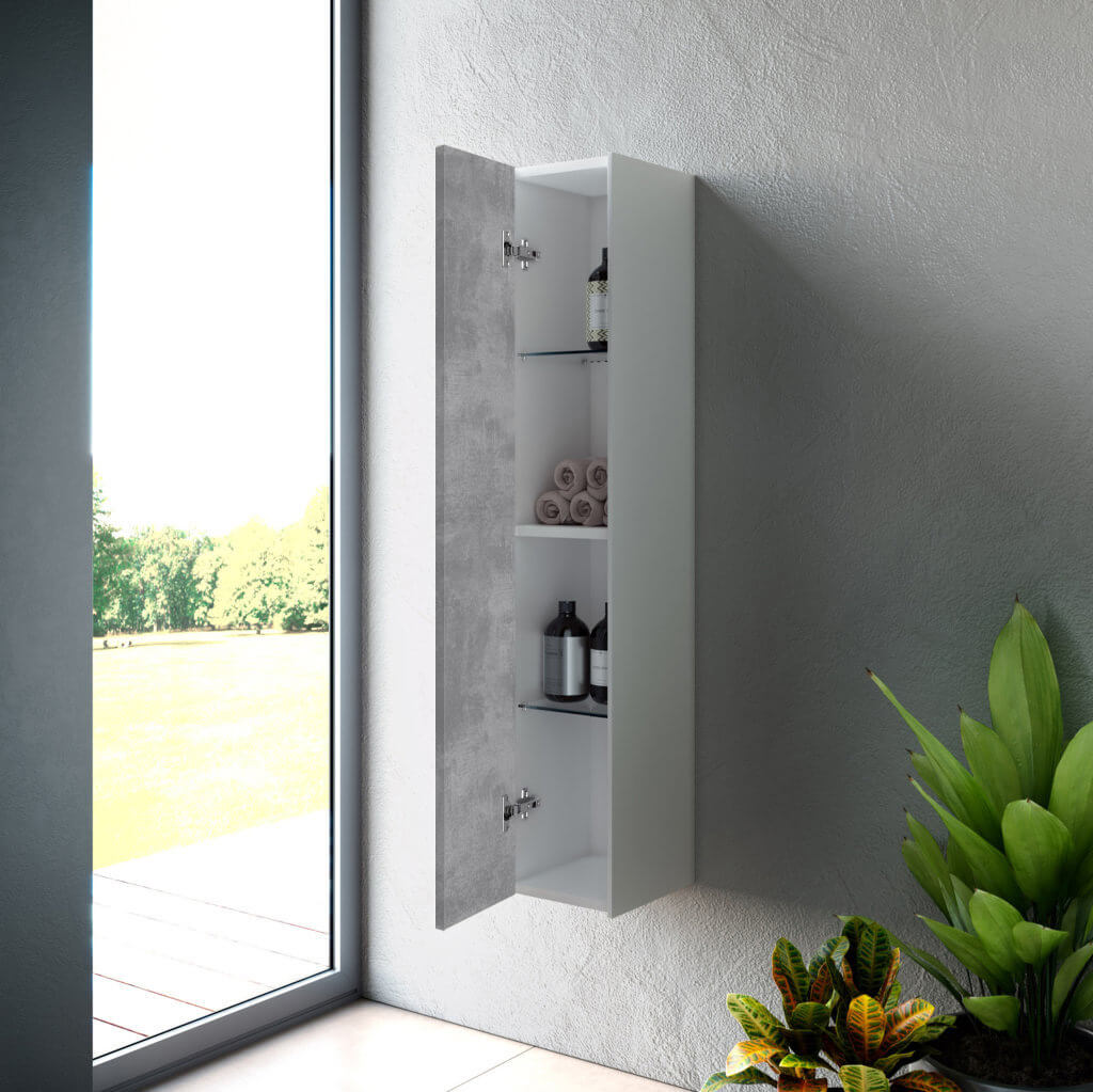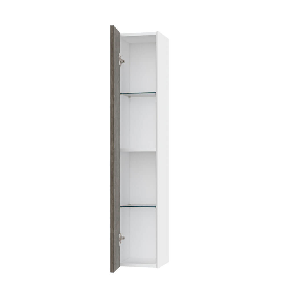 Elegante pensile colonna per bagno Made in Italy con installazione sospesa, pratico, reversibile ed elegante, disponibile in 12 finiture, realizzato in melaminico antigraffio con fianchi laterali laccati ed apertura push. Internamente la colonna dispone di due pratiche mensole realizzate in elegante vetro temperato + un ripiano realizzato in melaminico antigraffio. Pannelli certificati FSC. Made in Italy.