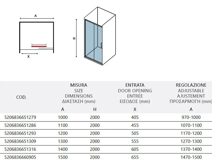 L’apertura scorrevole garantisce un ampio e comodo spazio di ingresso al vano doccia, variabile a seconda della misura: