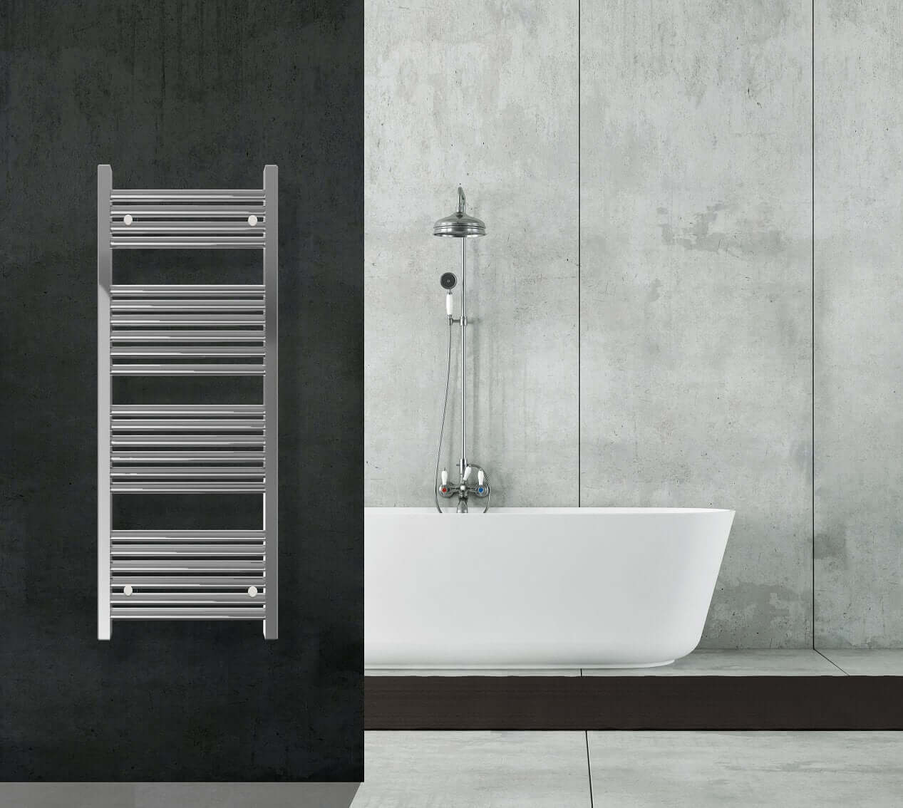 Termoarredo scaldasalviette per bagno a tubi dritti a sezione circolare in finitura cromata. Dimensioni 120x60 cm