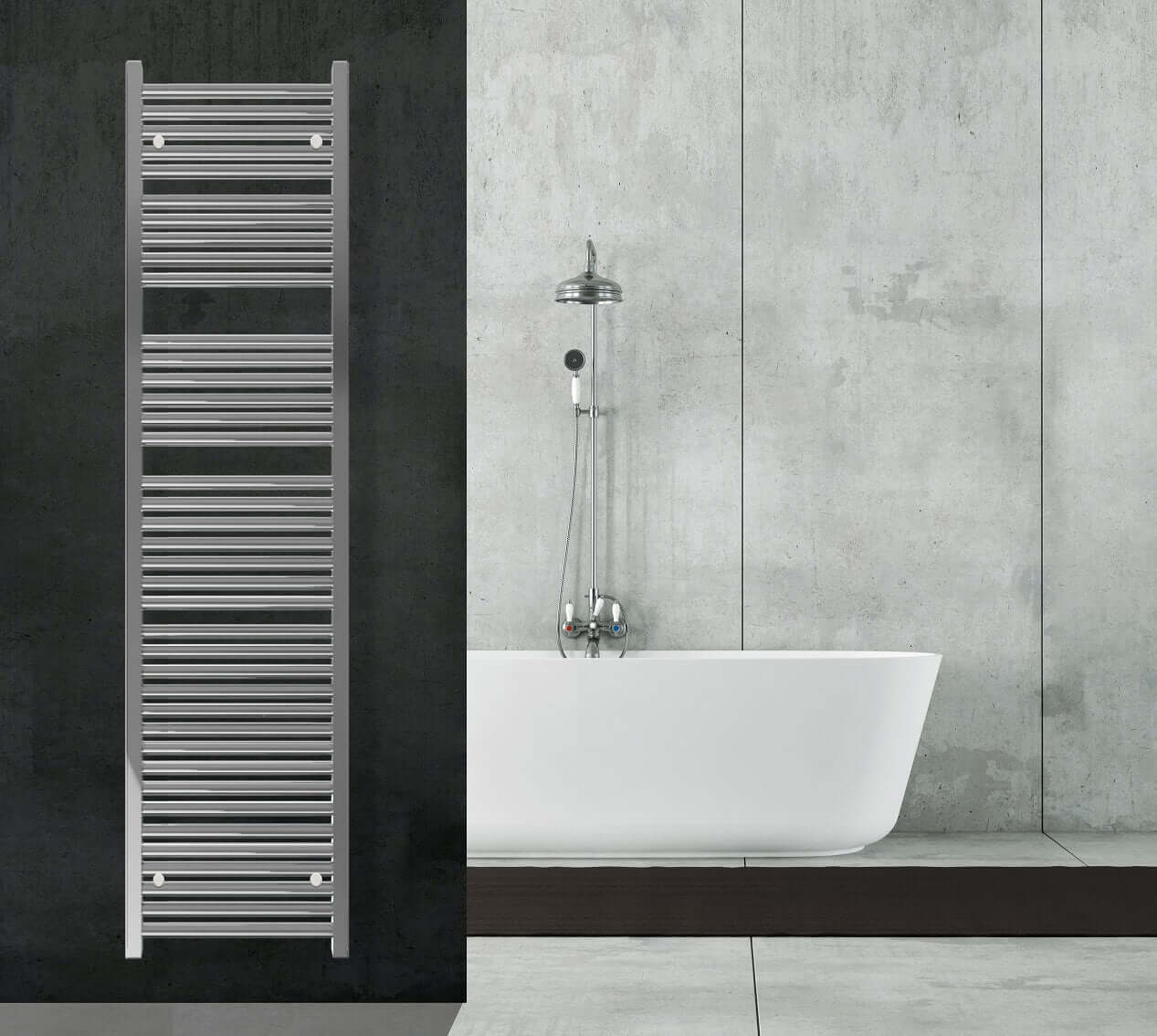 Termoarredo scaldasalviette per bagno a tubi dritti a sezione circolare in finitura cromata. Dimensioni 180x45 cm